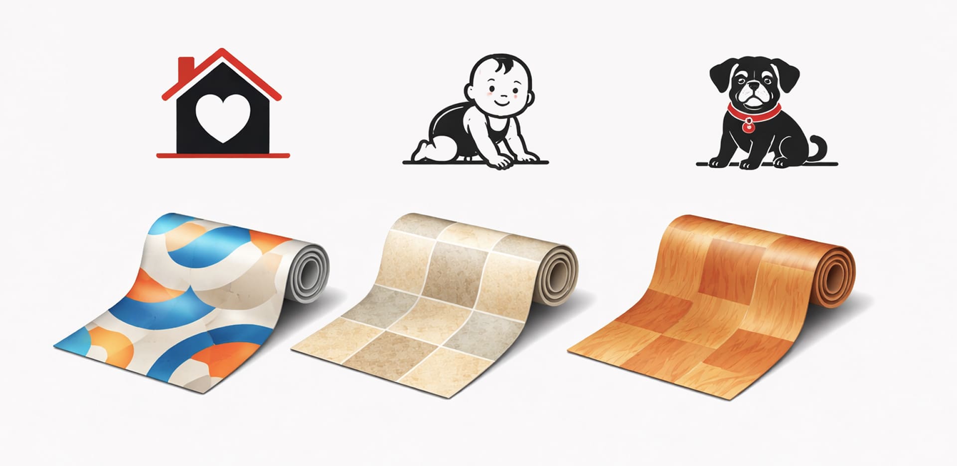 - Рисунок — абстракция скрывает мелкие дефекты, а имитация плитки или паркета требует аккуратной стыковки.